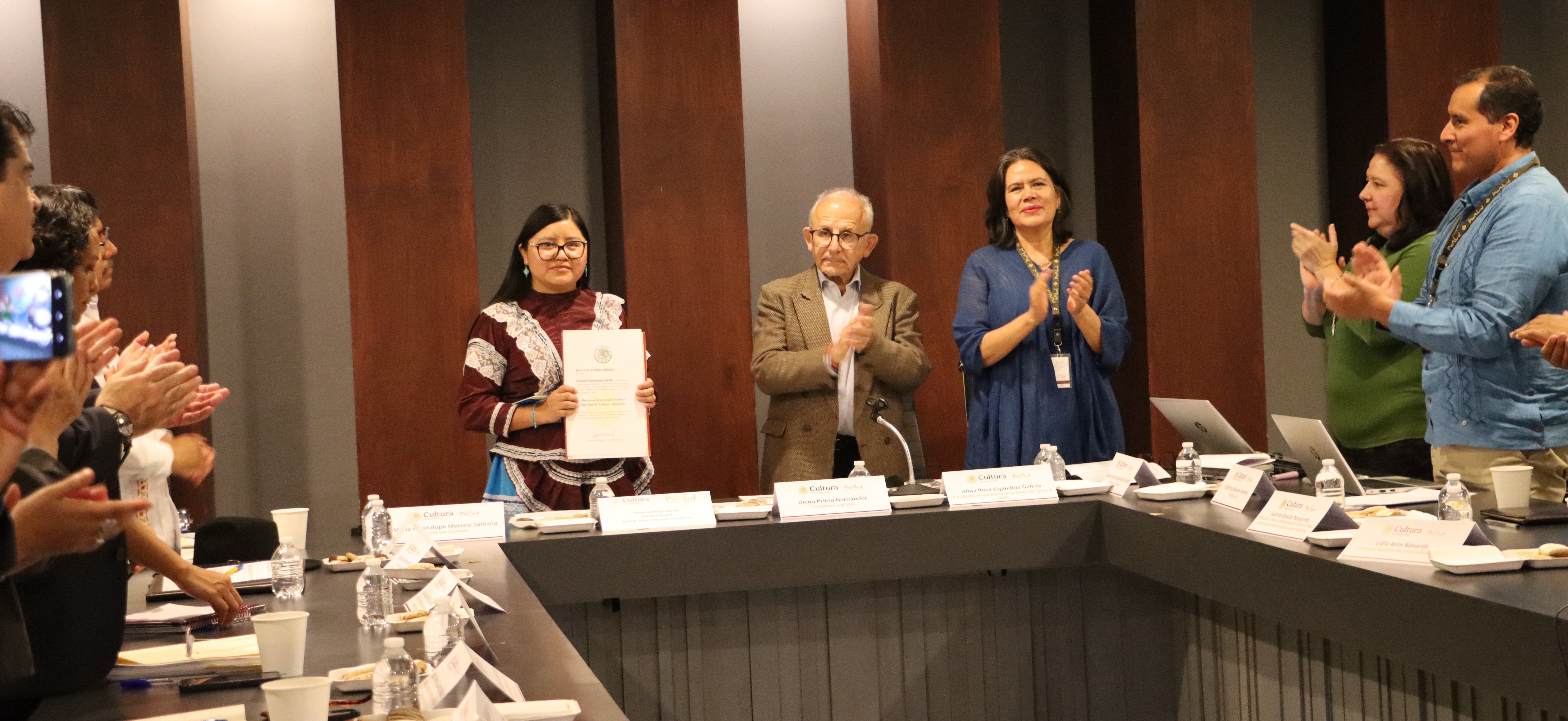 Durante la ceremonia realizada en las instalaciones de la Secretaría de Cultura del Gobierno de México, el antropólogo Diego Prieto Hernández, presidente del Consejo Nacional del INALI y titular de la Unidad de Culturas Vivas, Patrimonio Inmaterial e Interculturalidad (UCUVI), le hizo entrega del nombramiento realizado por la Presidenta de México, Dra. Claudia Sheinbaum Pardo, como nueva titular del Instituto, con fundamento en el Artículo 16 de la Ley General de Derechos Lingüísticos de los Pueblos Indígenas.